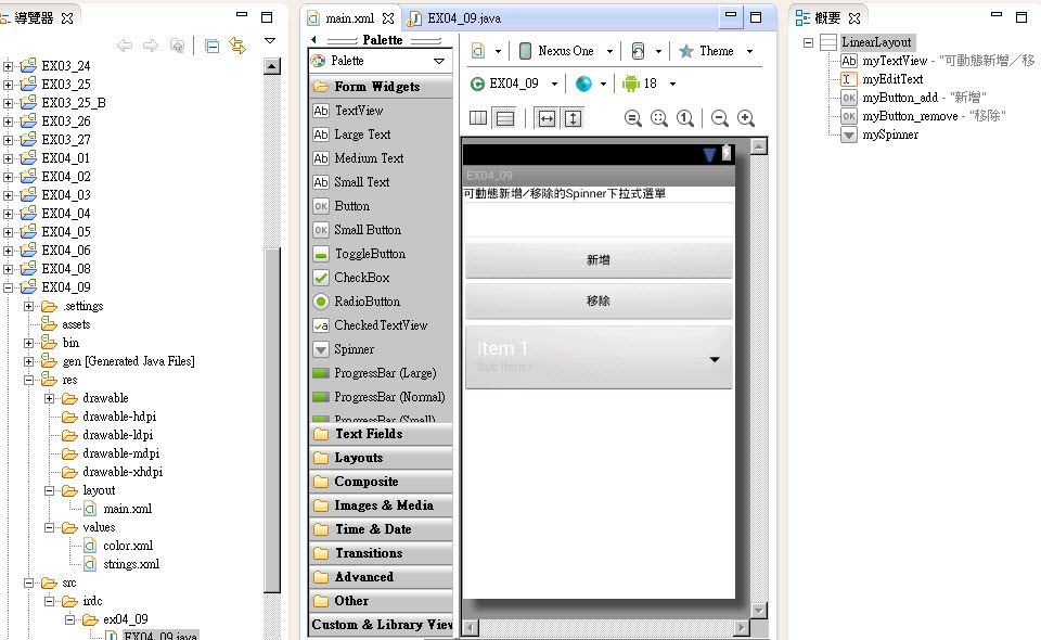 Android Sdk 開發範例大全3 第四章 超豪華手機控件 4 9新增 删除spinner選單 Arraylist與widget的依賴性